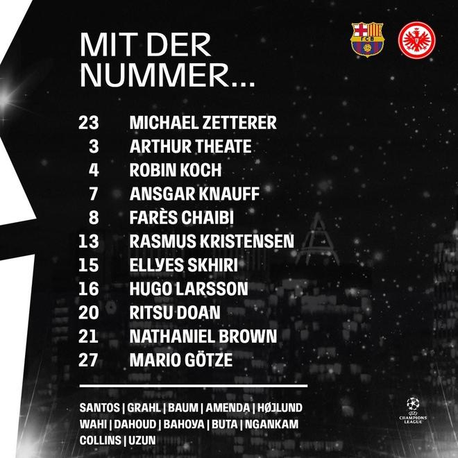 法兰克福首发:23-泽特尔、21-纳撒尼尔-布朗、3-阿蒂尔-蒂特、4-科赫、13-拉斯穆斯-克里斯滕森、27-格策、15-斯希里、8-沙伊比、16-胡戈-拉松、20-堂安律、7-克瑙夫